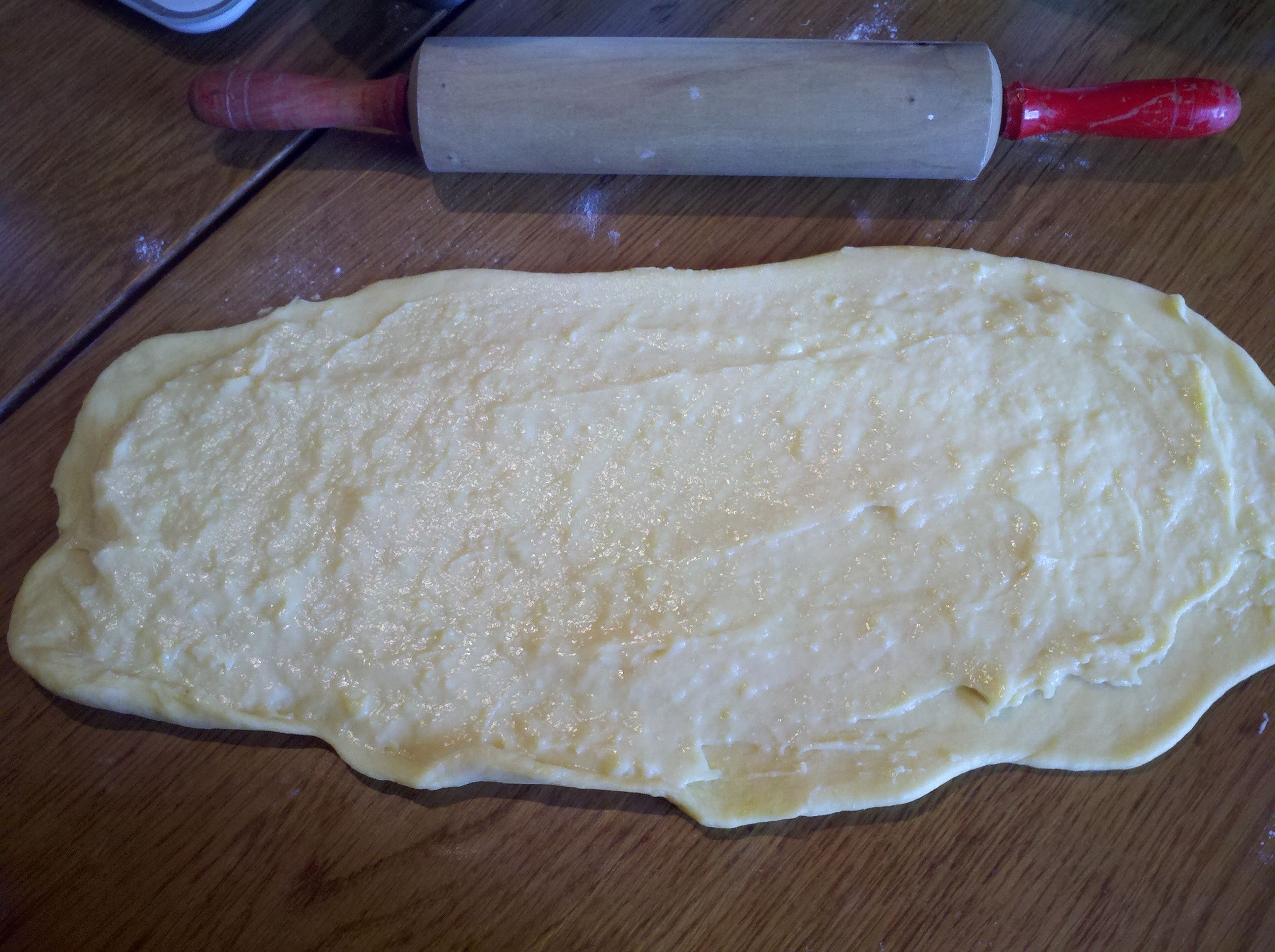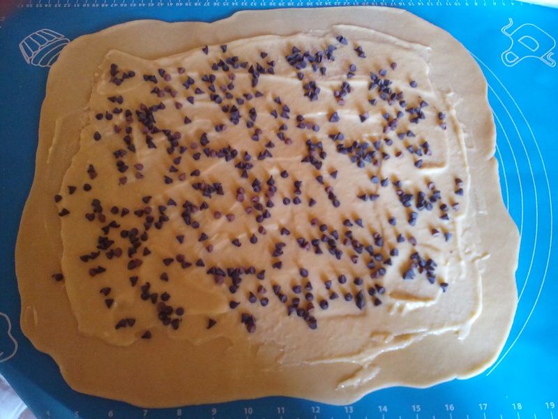 - une fois la première poussée faites de la brioche, dégazer la pâte, puis étaler la pâte en rectangle, étaler dessus crème pâtissière