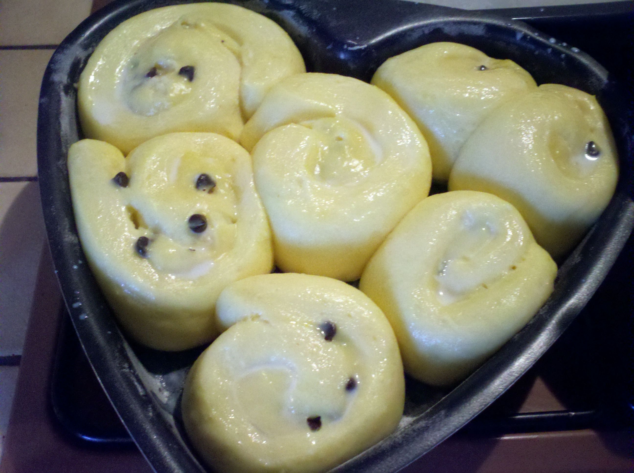 Une fois roulé et coupé en tronçons placer dans moule en laissant de l'espace pour le gonflage au moment du poussage